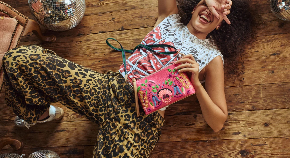• Iconic floral embroidery on Ivy hot pink glitter exterior